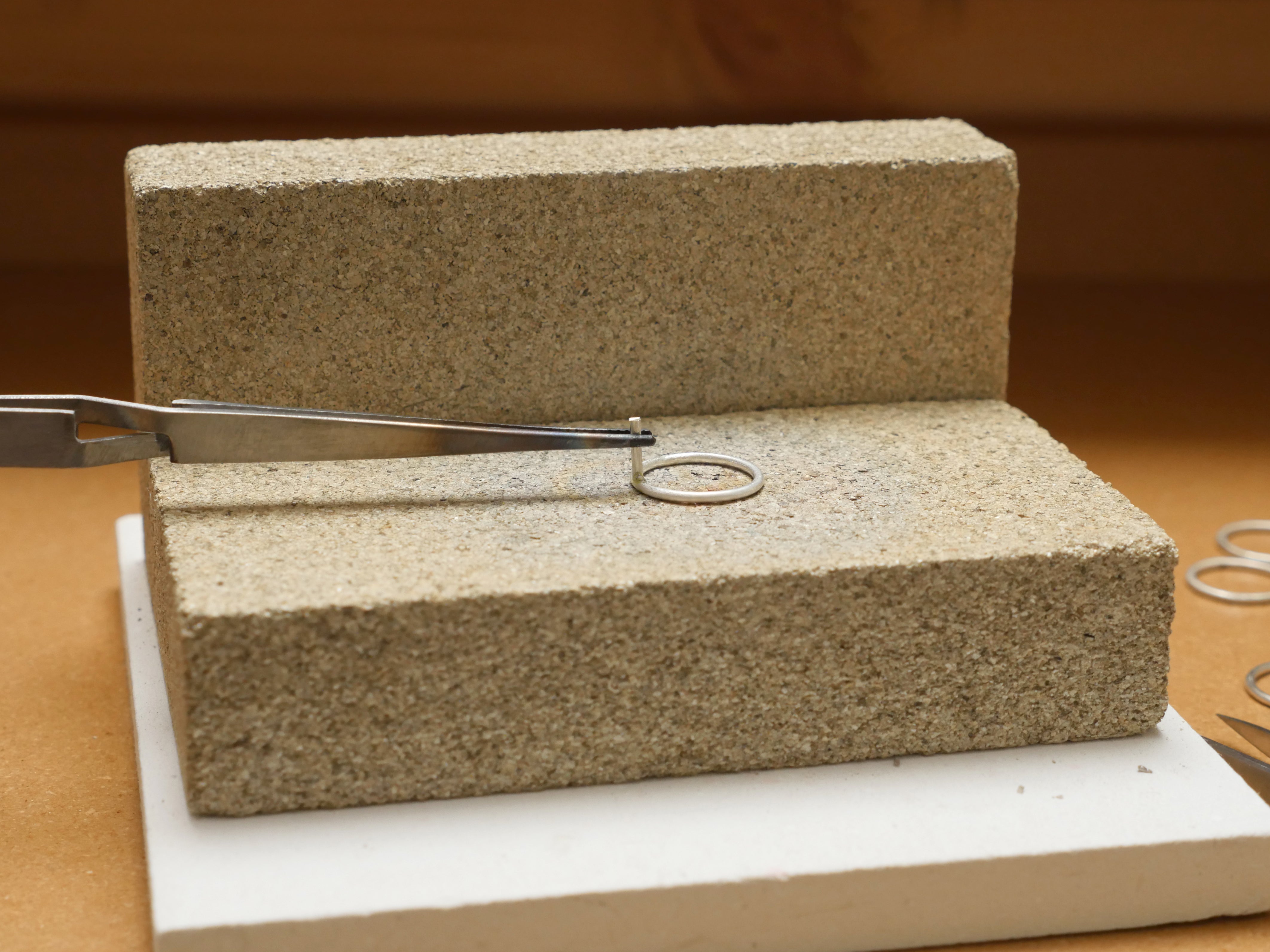 Start further away at first, and point the torch at the workpiece. Begin making gentle circles with the flame as you approach closer, heating the entire ring evenly. If the flux spits and moves the solder away from the ring, use your pick to push it back into contact with the ring. Once you are close enough to apply the hottest part of the flame to the workpiece, continue making slow circles until the metal glows bright red, at which point the solder should melt and flow into/around the joint. Continue heating for just a few seconds more, until the solder has fully enveloped the area, then remove the heat and turn off your torch (set it down somewhere safe to cool).