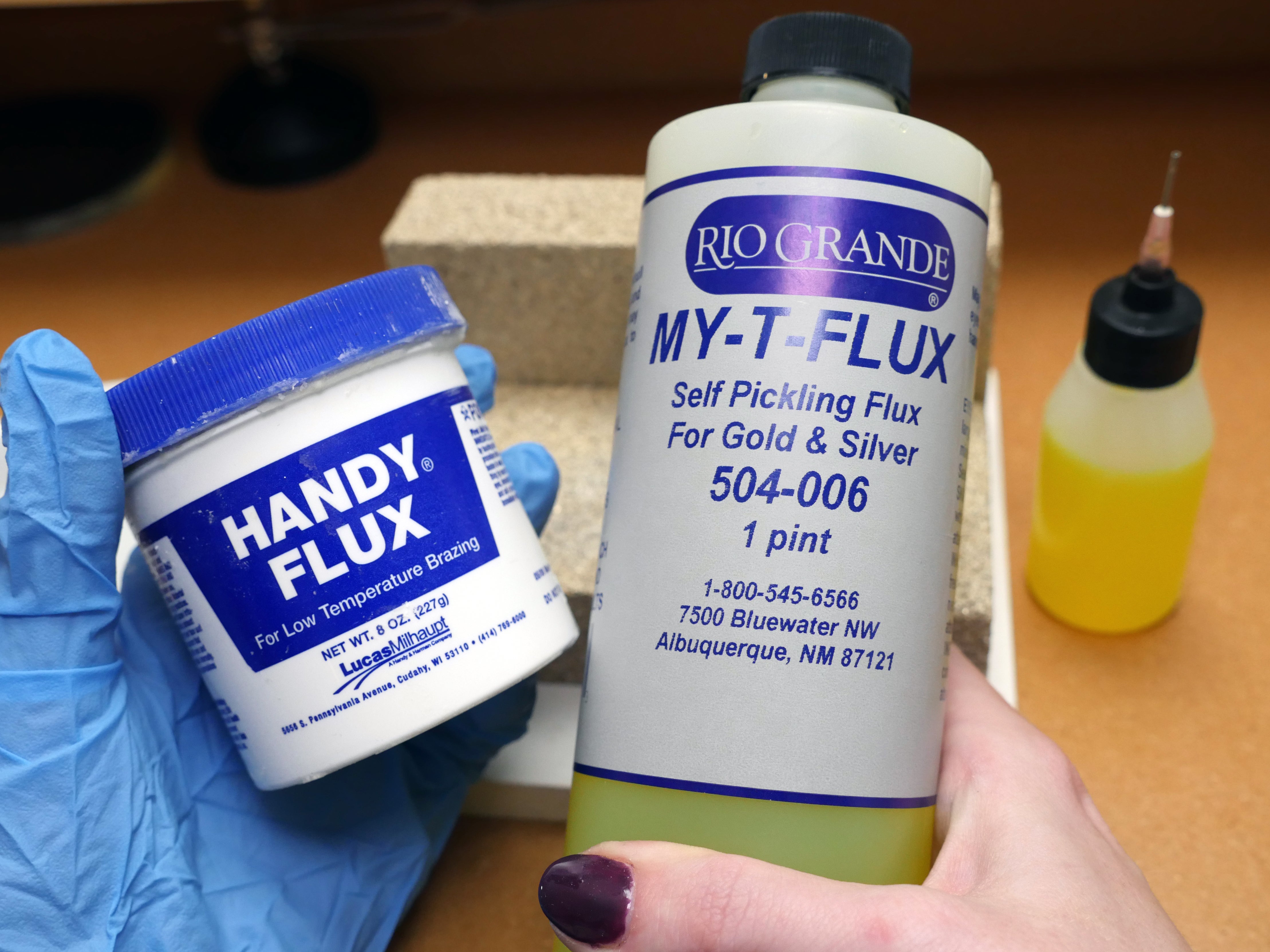 You can choose to coat the whole workpiece in flux, or just the area to be soldered. Pictured on the left is a ring soldered after being covered completely with paste flux. The ring on the right was soldered after a small drop of yellow liquid flux was applied to the joint, resulting in more firescale on the rest of the workpiece.