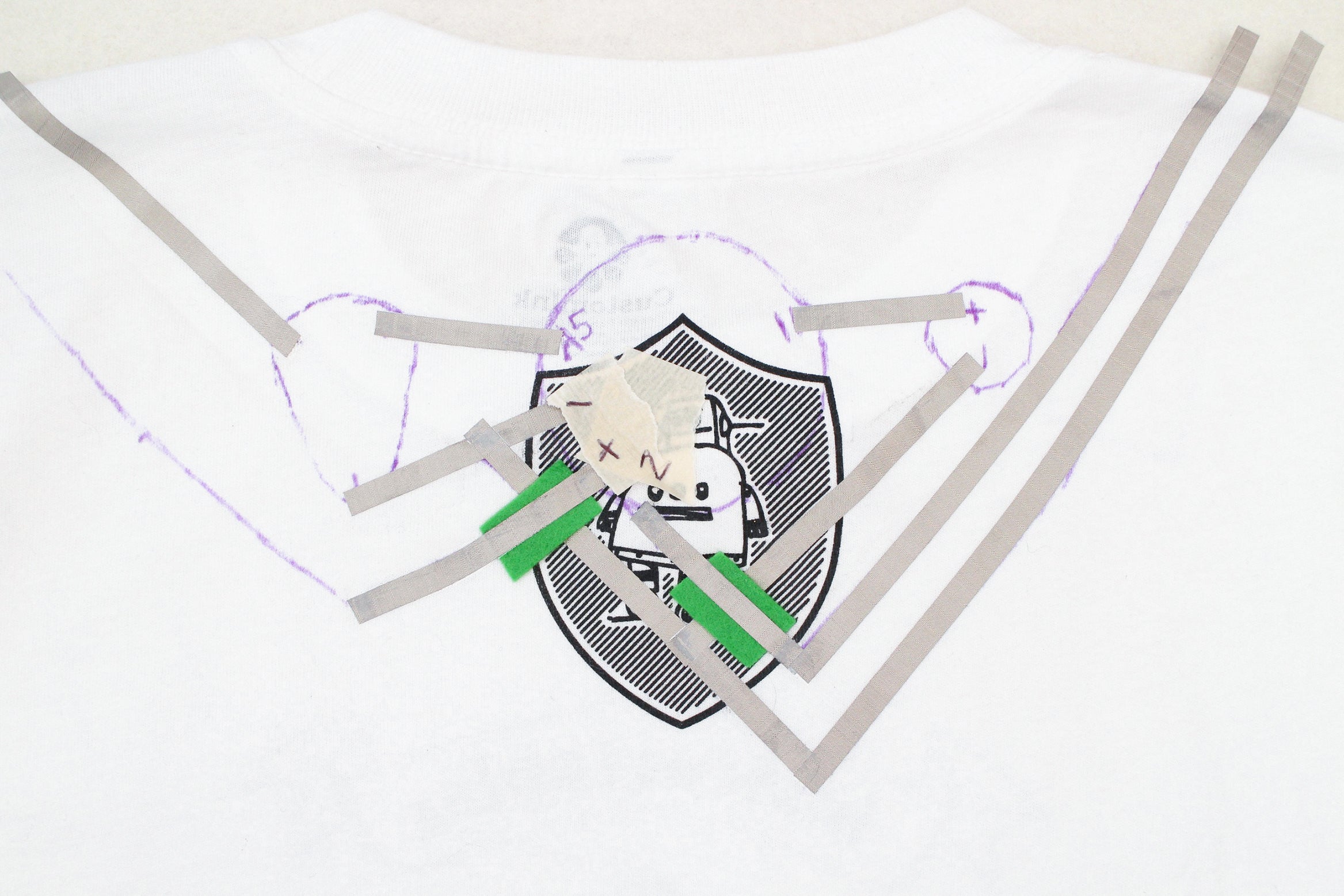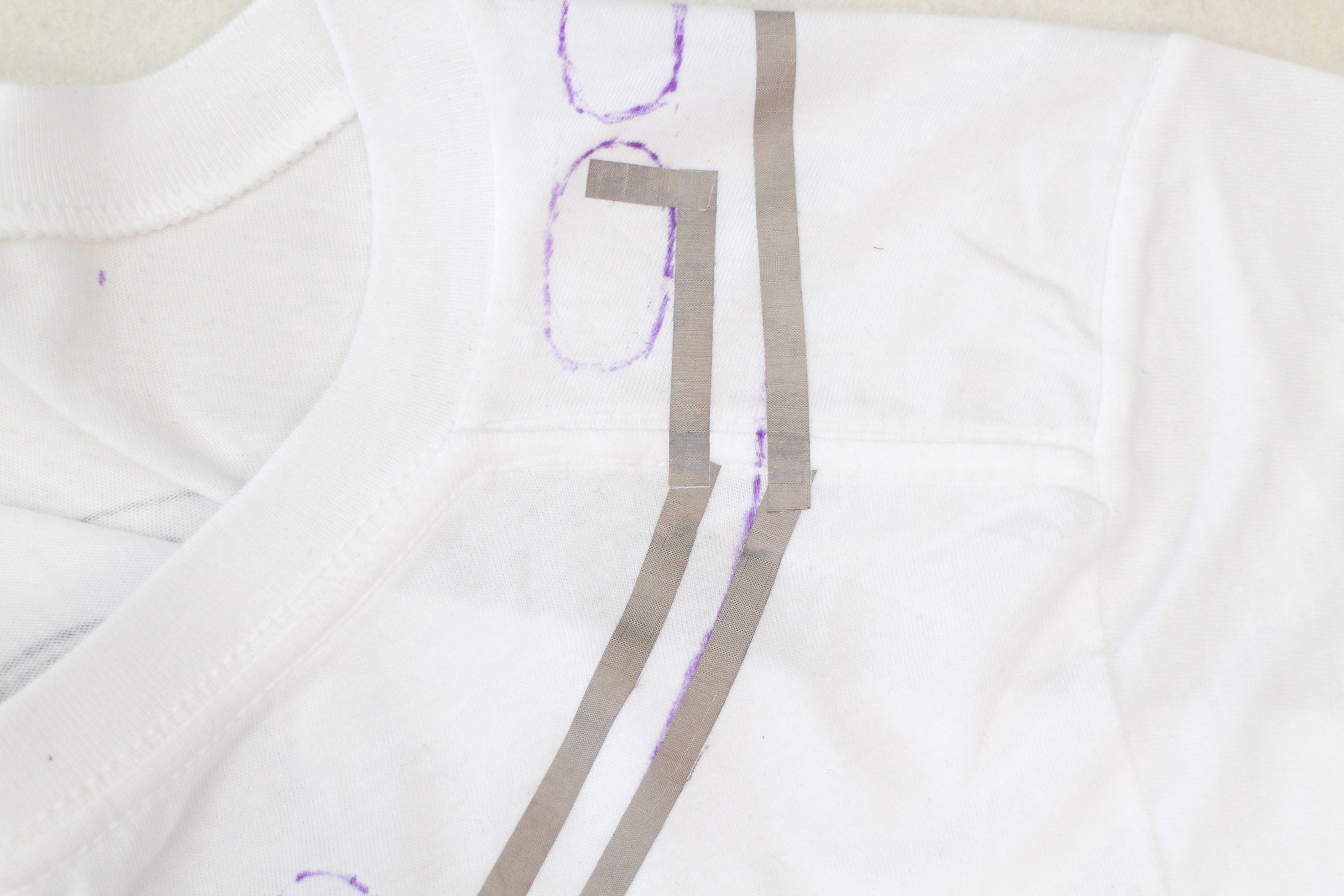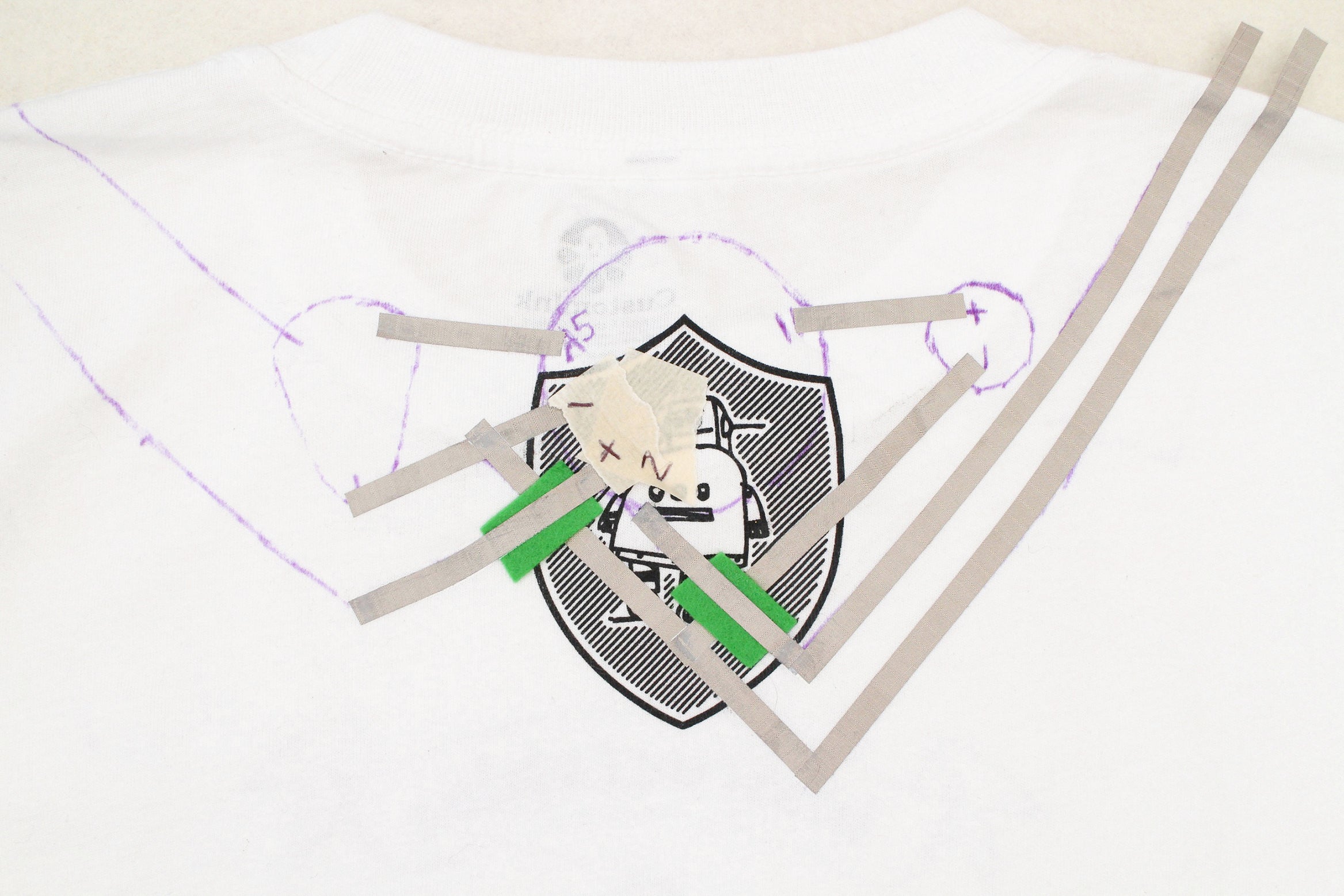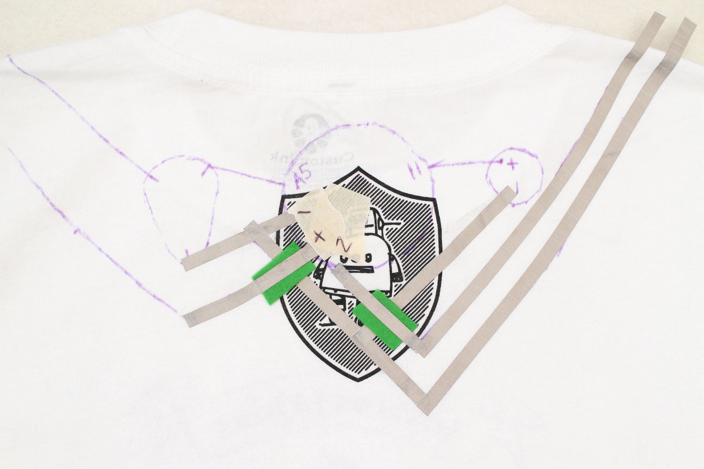 Keep the t-shirt laid out with it's back facing up and fold the shoulder back to get to your marks. Put two marks on the bottom halves of each contact. This is where the conductive fabric traces need to connect to.
