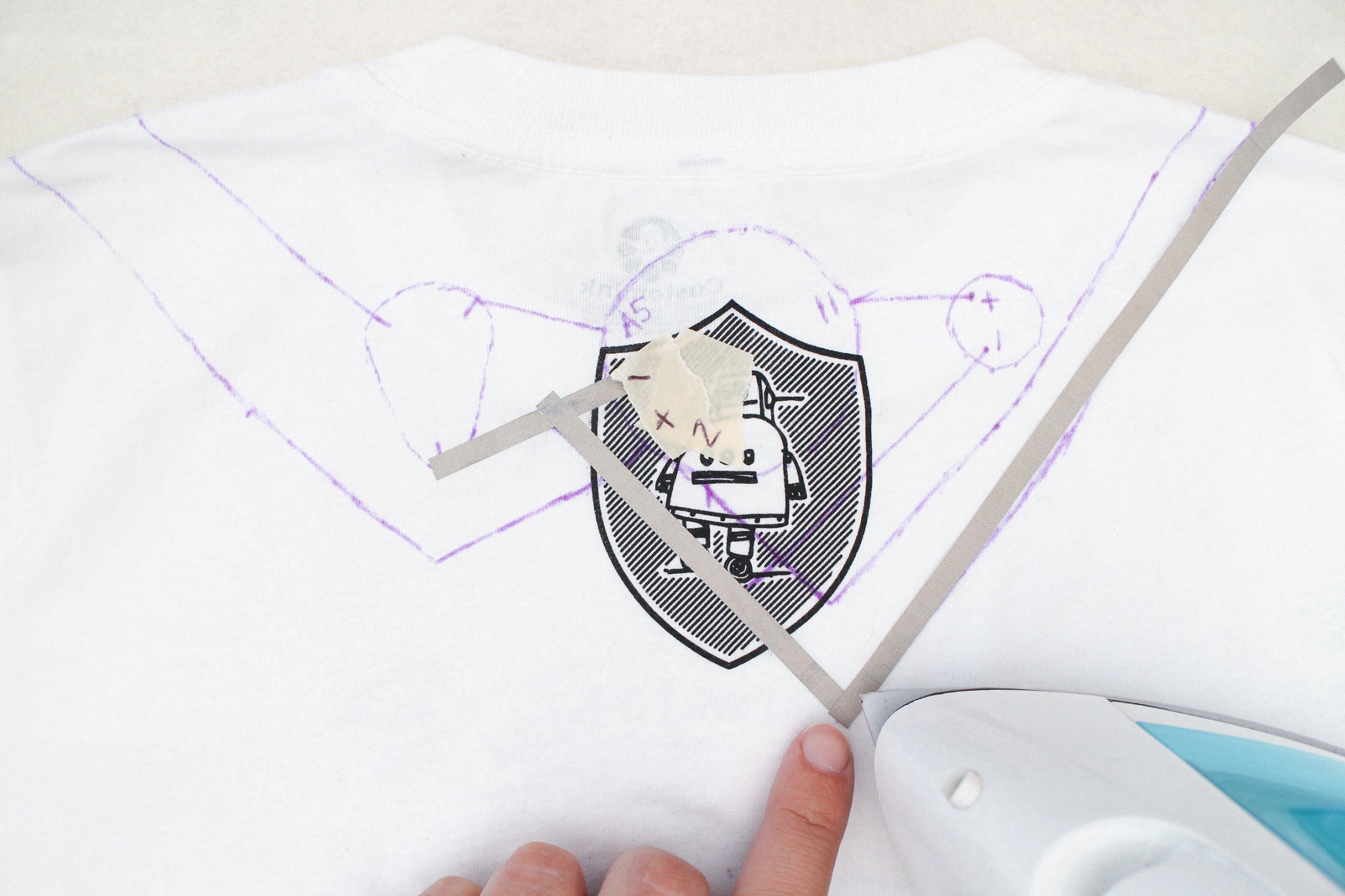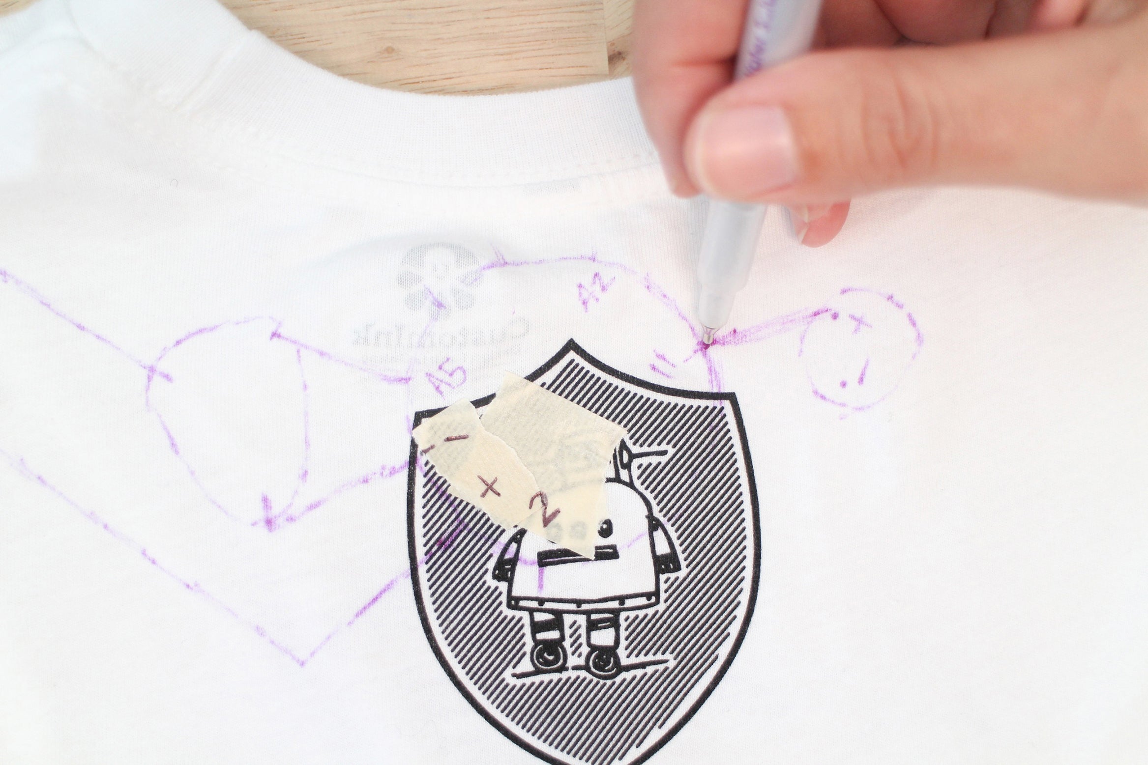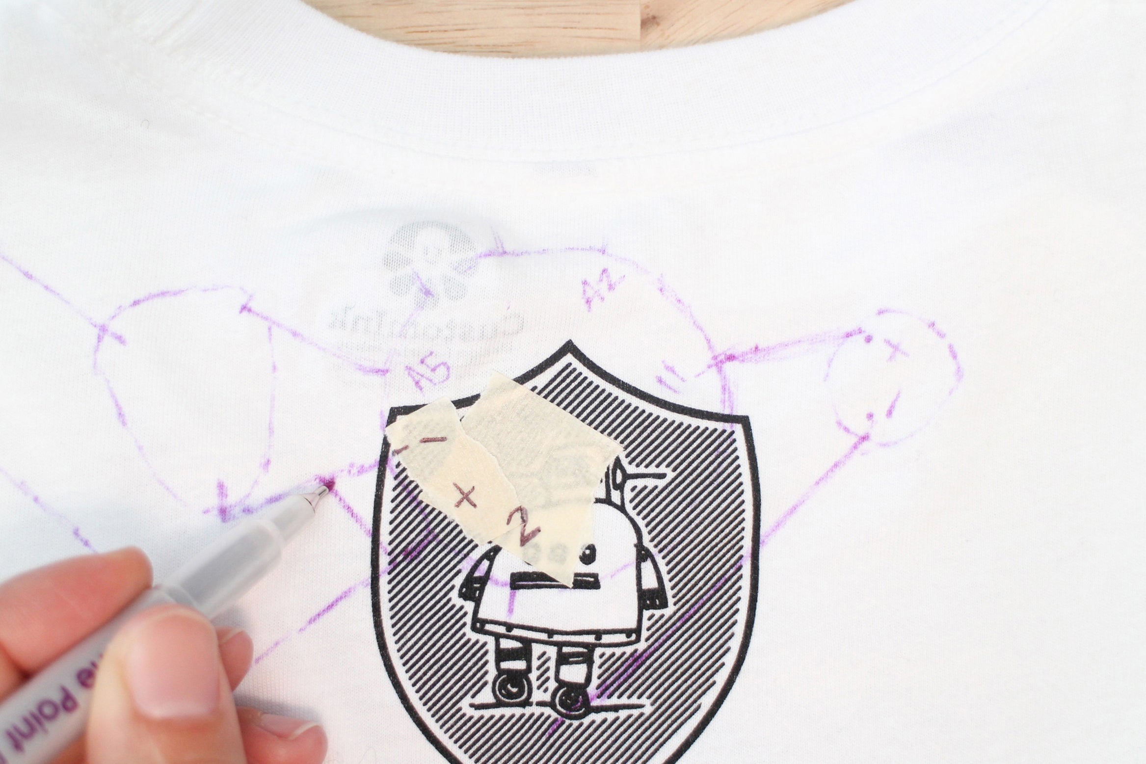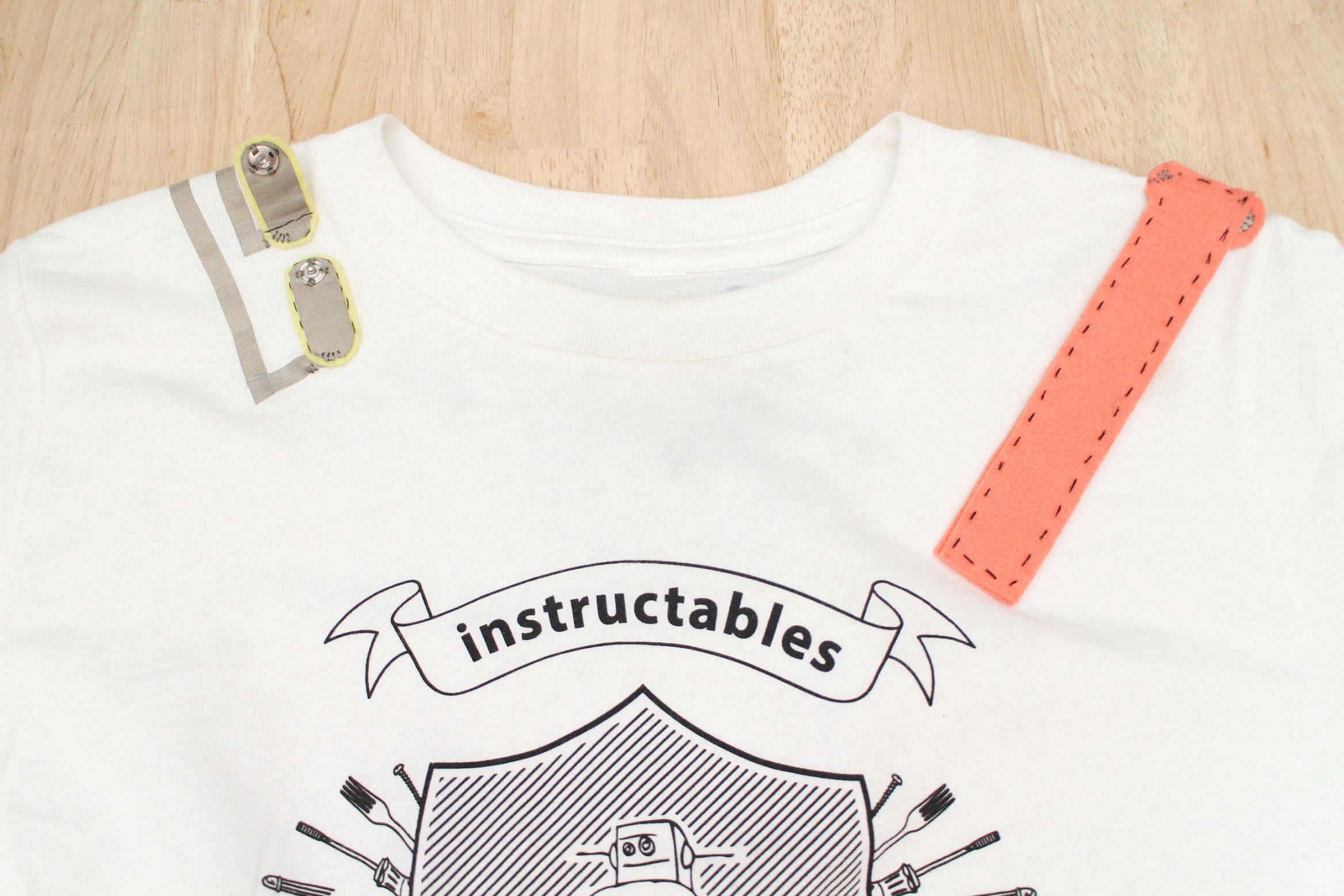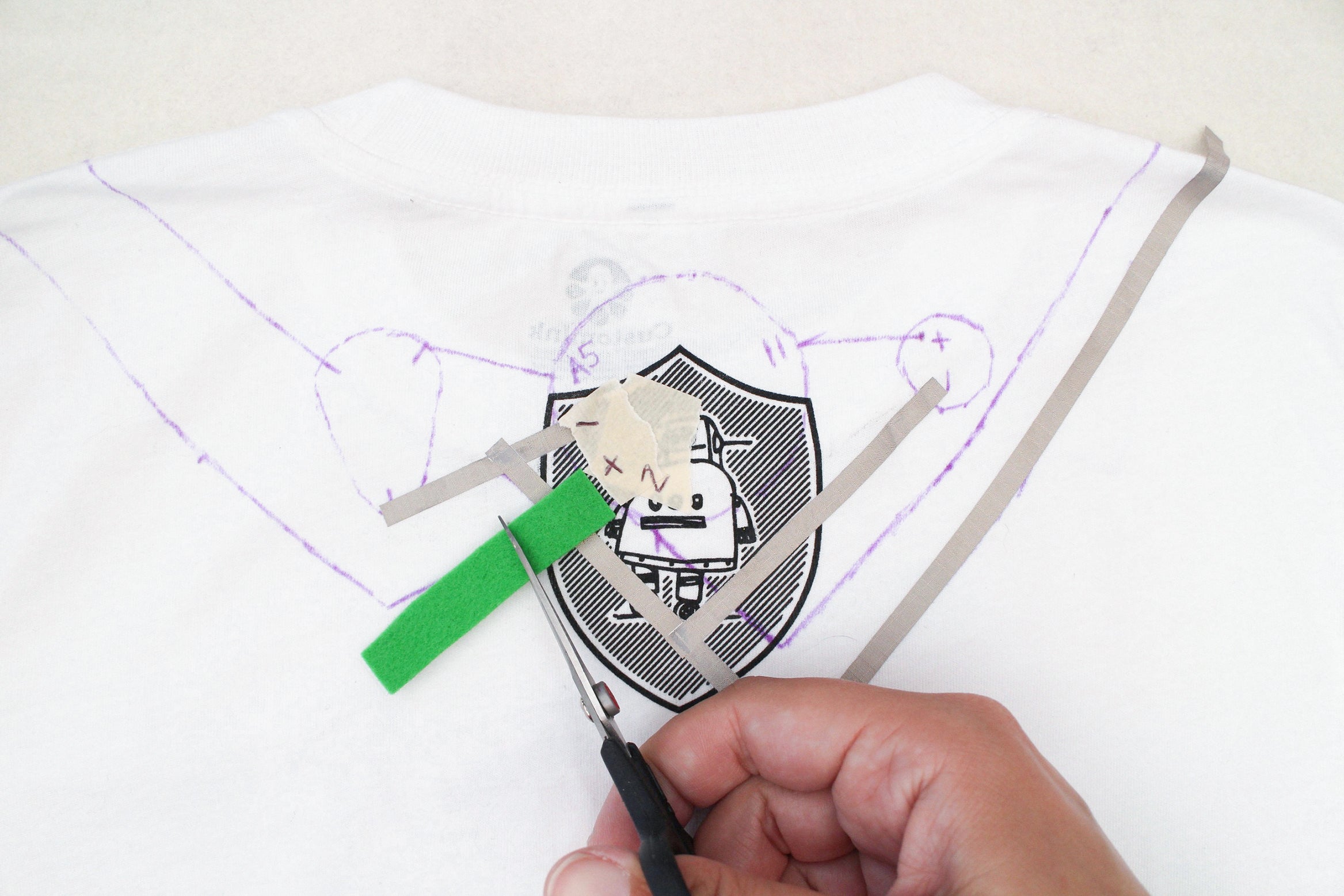 Keep the t-shirt laid out with it's back facing up and fold the shoulder back to get to your marks. Put two marks on the bottom halves of each contact. This is where the conductive fabric traces need to connect to.