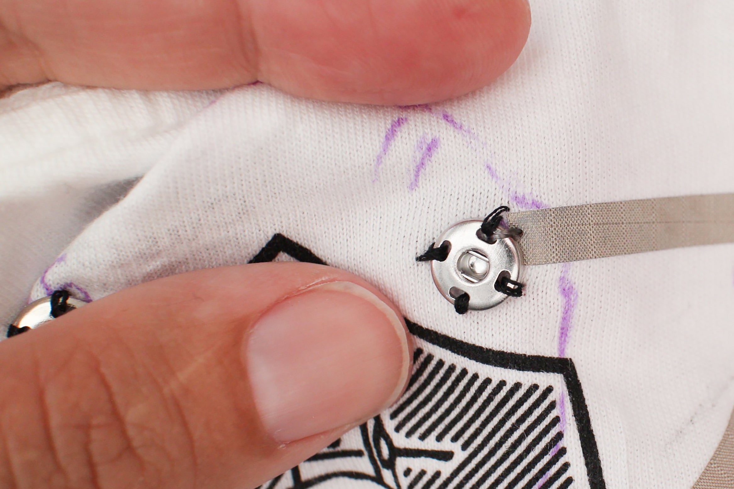 Center each snap over the marks and sew down using regular thread. The snap should overlap the end of the trace. After each snap is sewn with regular thread use conductive thread to finish connecting each snap to their trace. Check all the connections with the multimeter.
