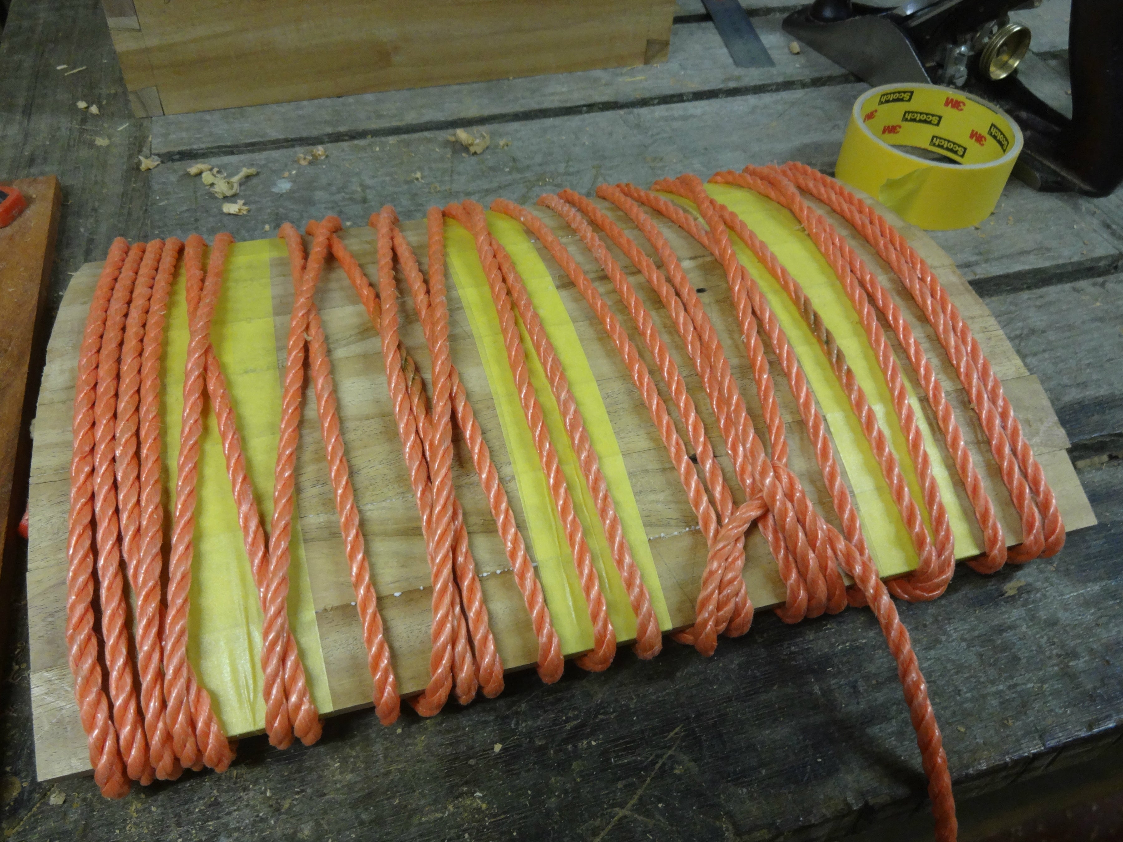 Once all your edges are planed at an angle, put some painters tape on to hold them together (pic 4). Now flip it over and put glue between the strips on the bottom side (pic 5). Put some more tape all around the lid, nice and tight so you get a good glue squeeze-out (pic 6). There's no good way to clamp such curved surfaces, so to be on the safe side, wrap it in rope to add some extra pressure: