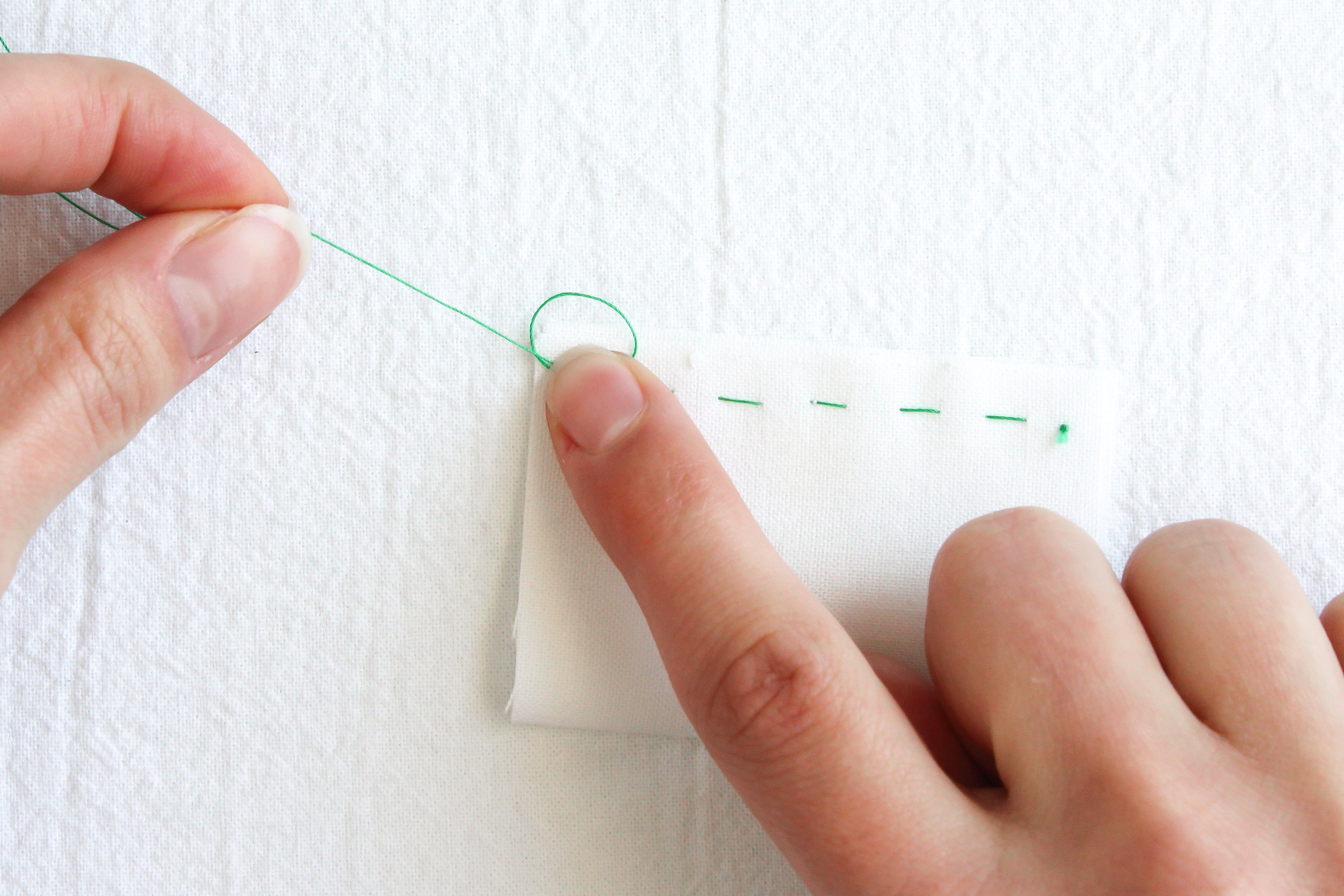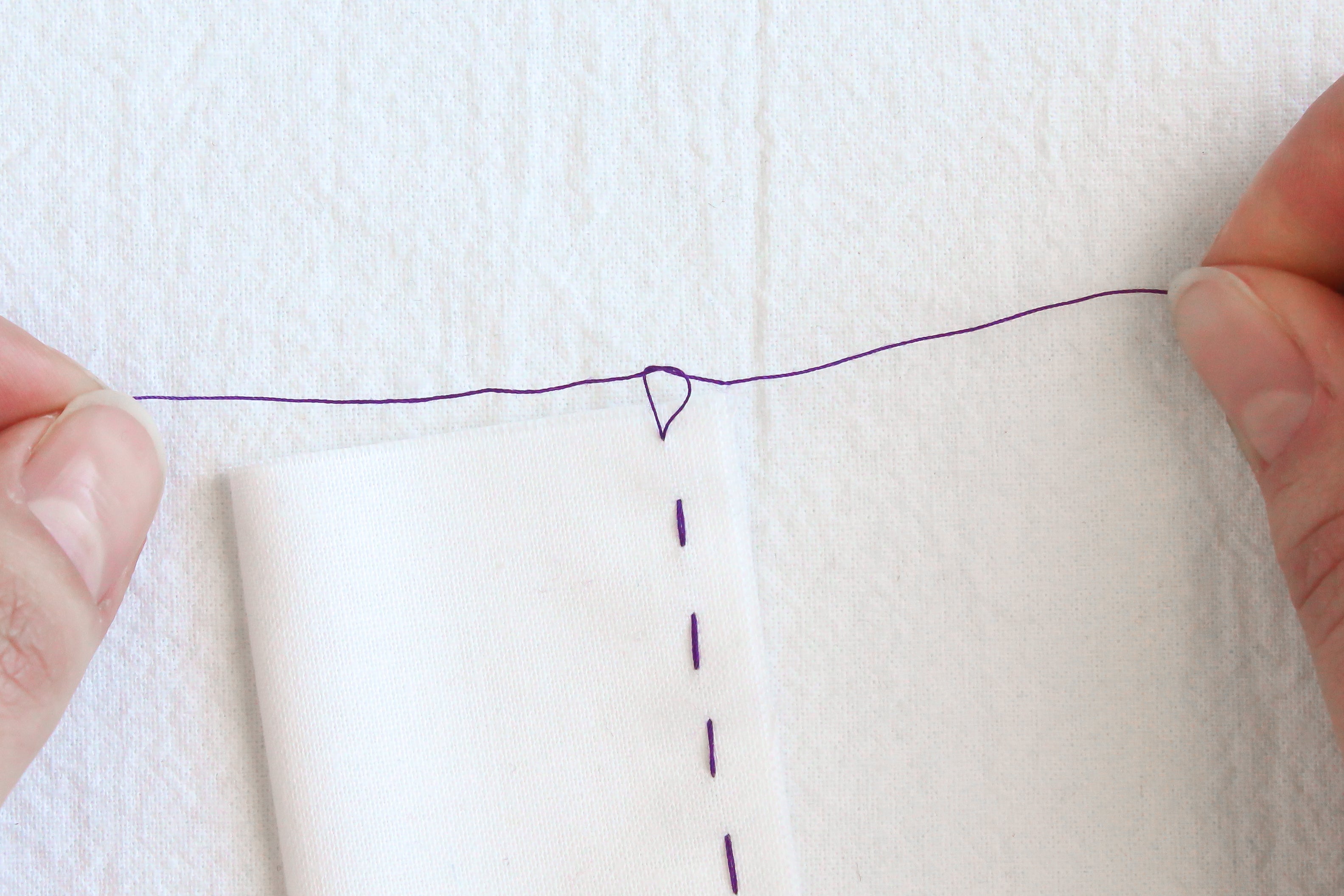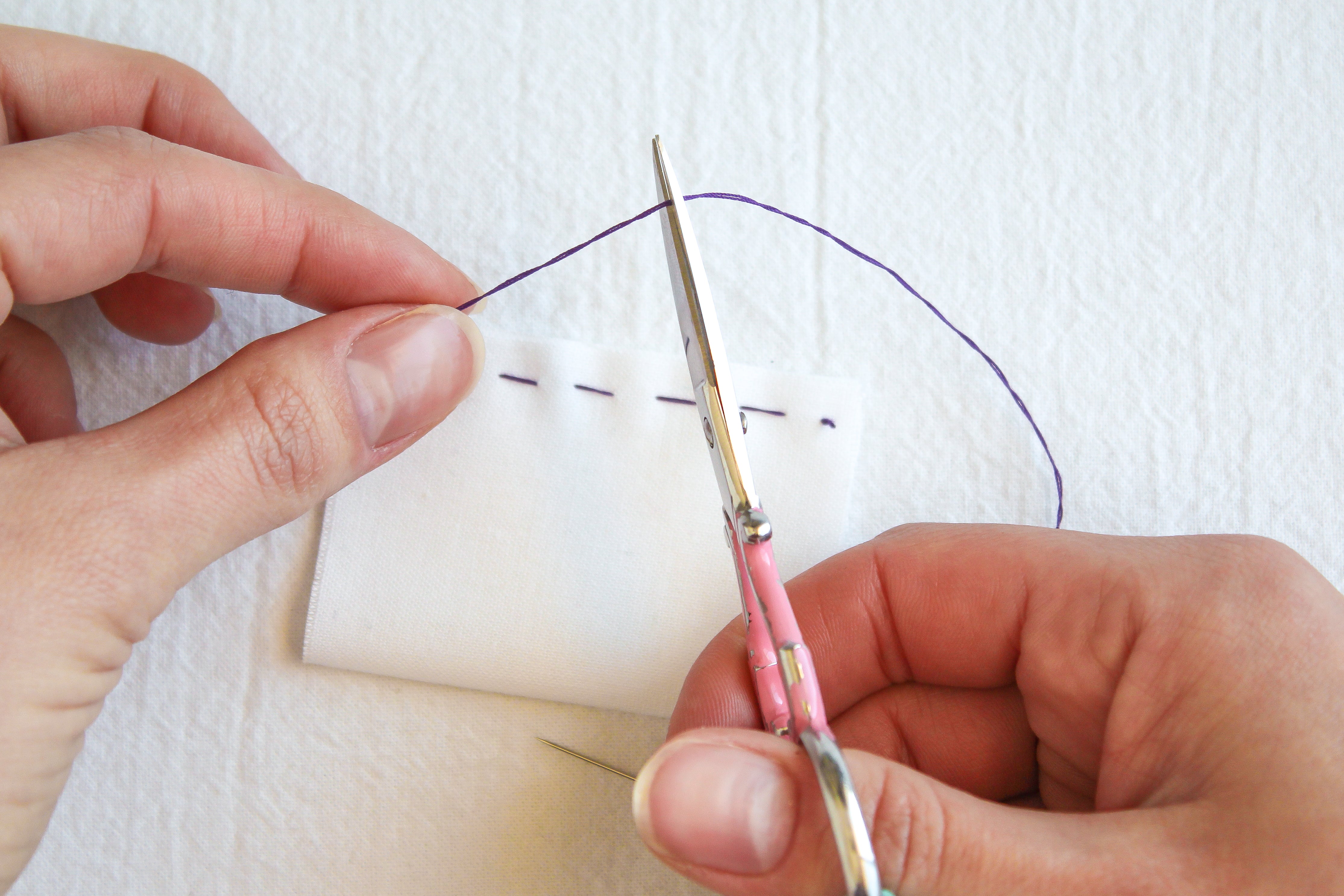 At the end of your line of stitching, make a very tiny stitch (this stitch should go through both layers of fabric!) and pull the thread through.