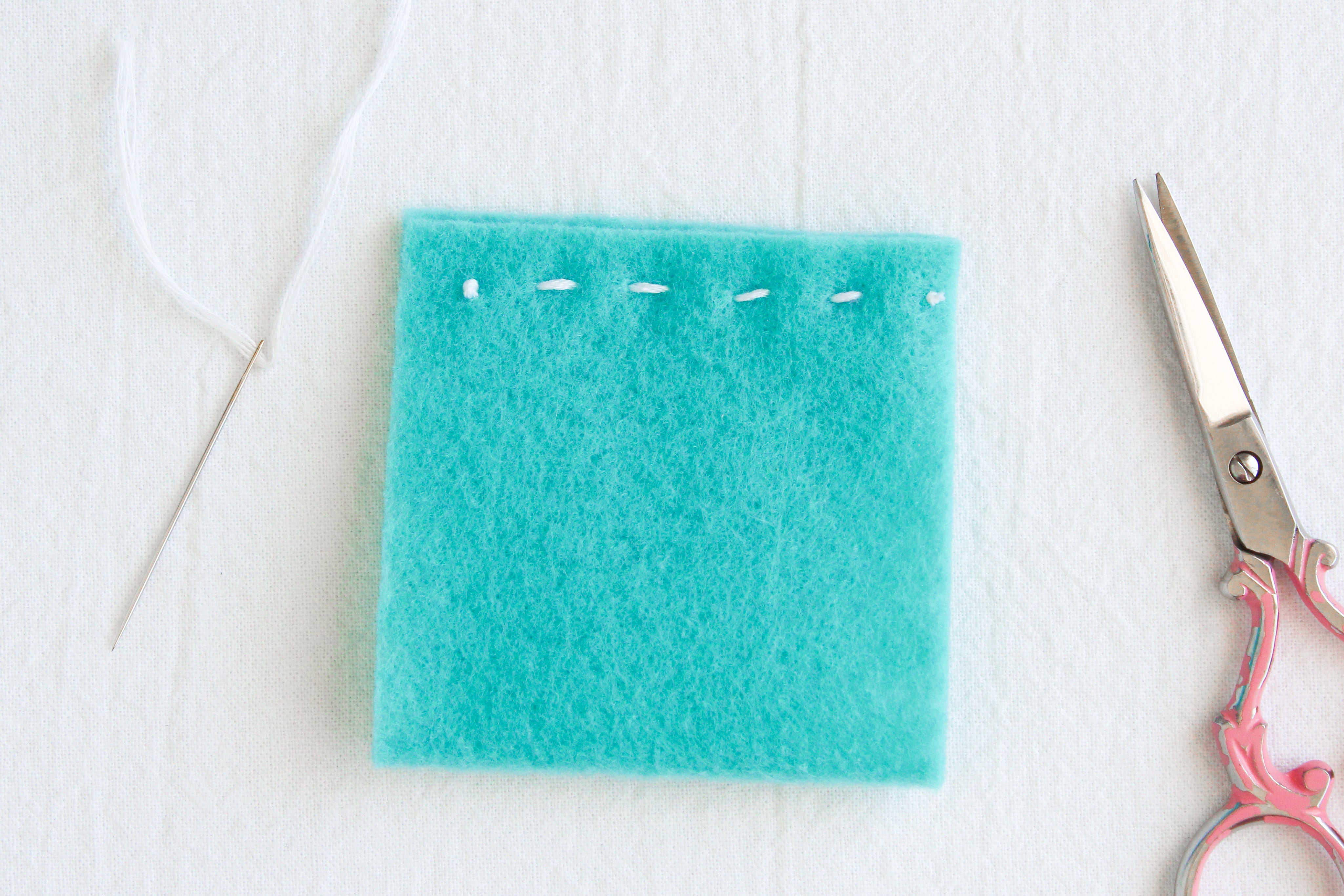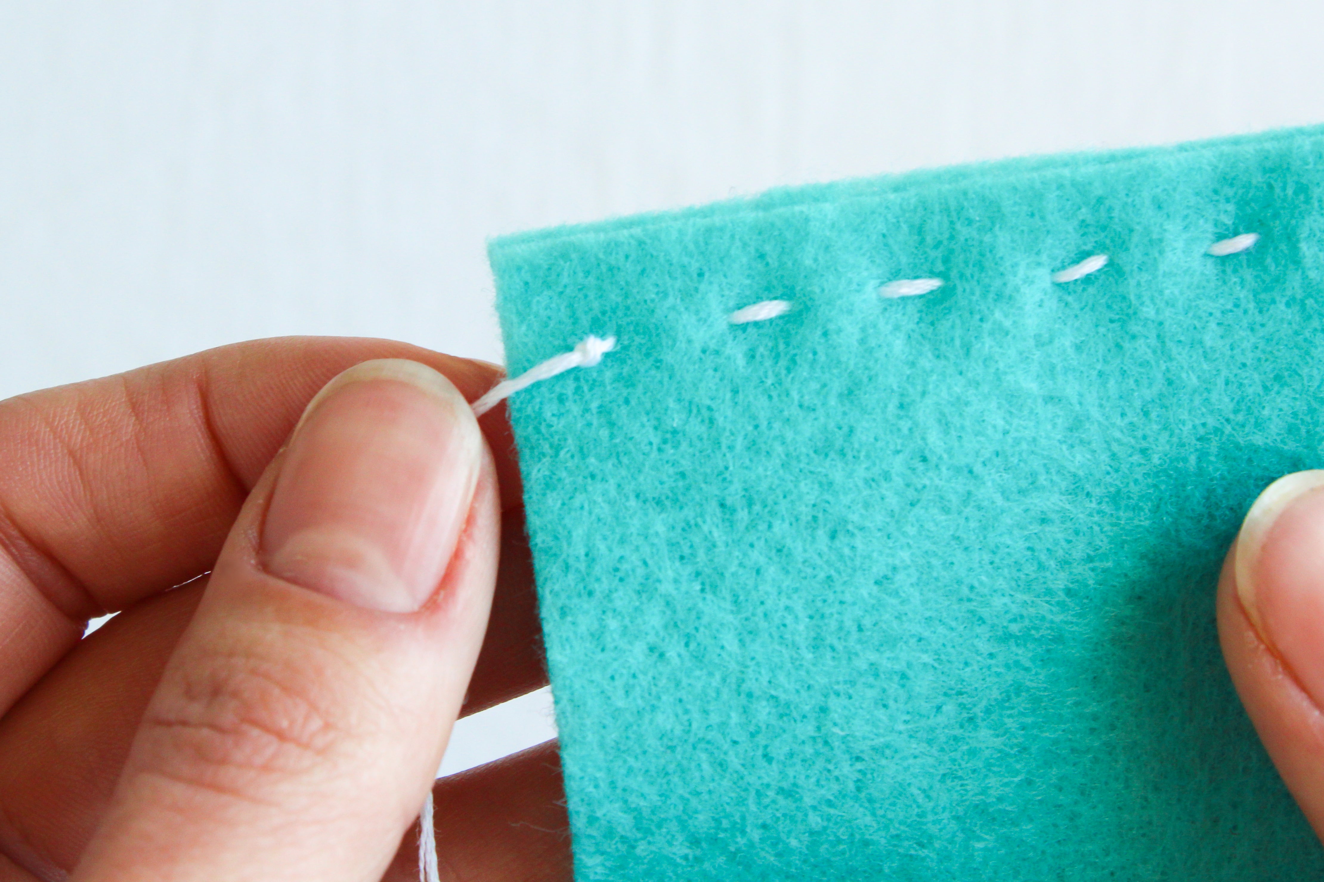 Insert the needle next to the knot and bring it back out in the middle of the felt. Make sure the needle is between the two layers of felt!