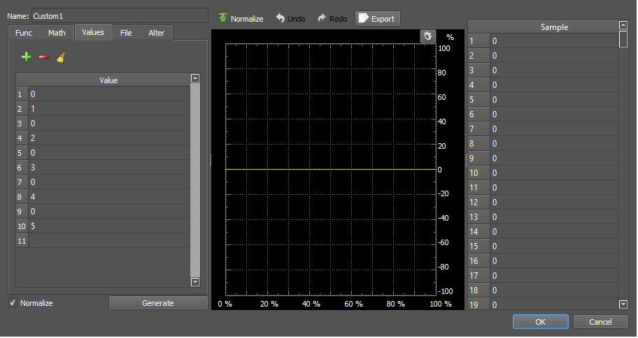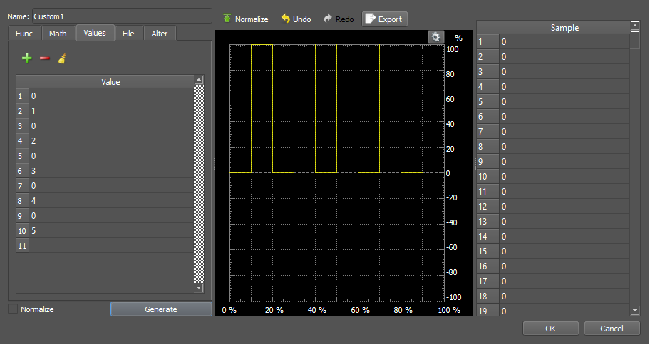 This option is really good for building step functions. You can have up to 100 values in the table on the left. The Sample table on the right is the list of all 4096 samples that the device can have in its buffer and these will auto-populate once you generate your signal. Remember that whatever you see in the editor plot window is what will become one full period of your signal. You can use any value you want, and with "Normalize" checked, the values will scale, relative to the max and min values given, to fit in the plot. We can see that with the default values.