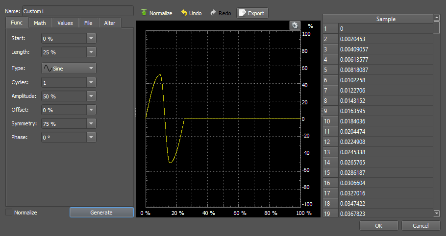 Start in the "Math" tab, make sure "Normalize" is checked, and generate a sine waveform using the function "sin(2*PI*X)". Don't click "OK" yet.
