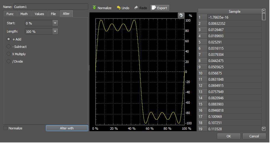 Click "Alter with" again, and repeat the process with "sin(2*PI*X*5)/5".