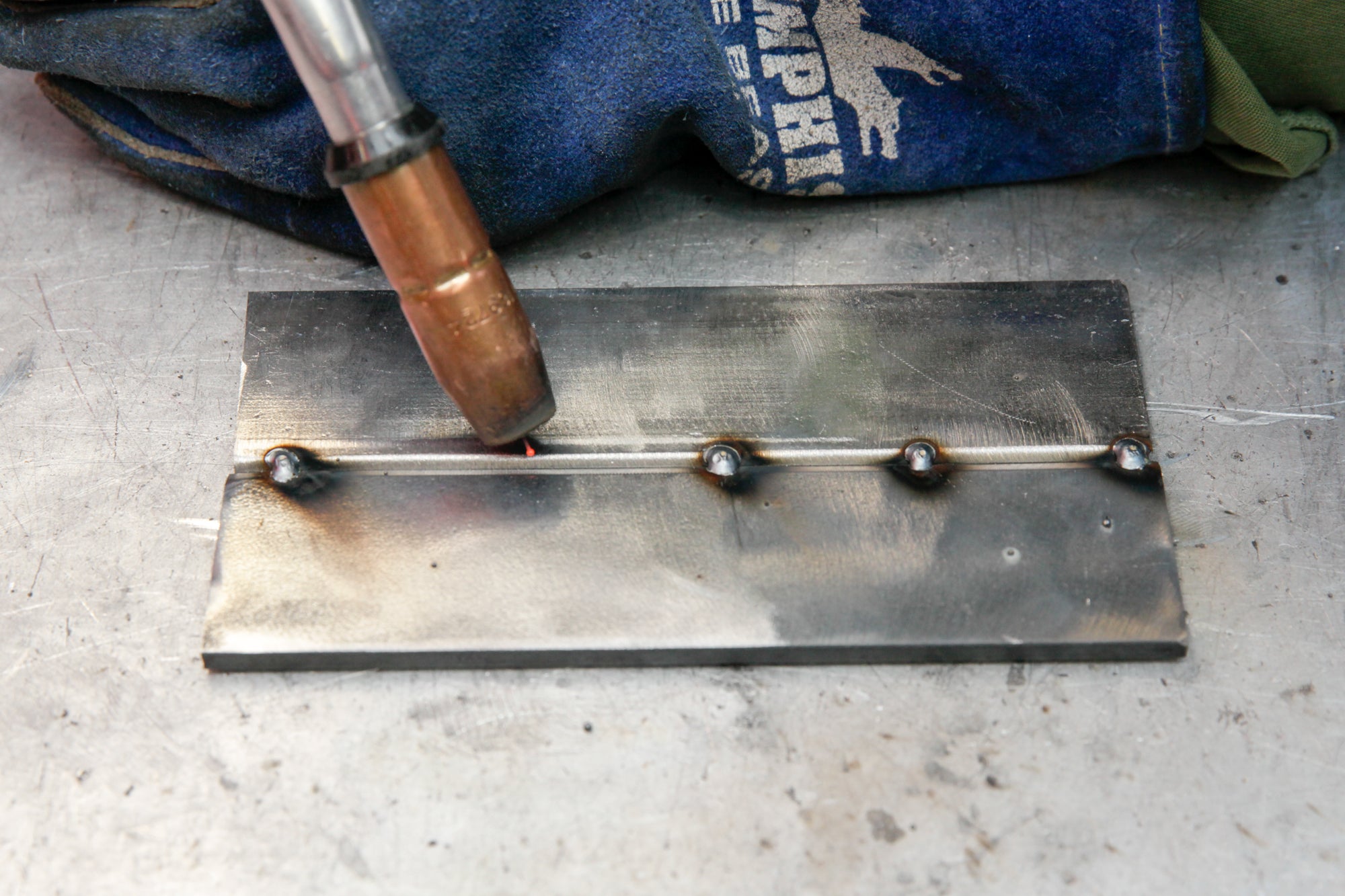 Repeat this action, alternating side to side so that the heat spreads evenly until you have tacks spaced 1" to 1.5" apart across the span that is being butt-welded together.