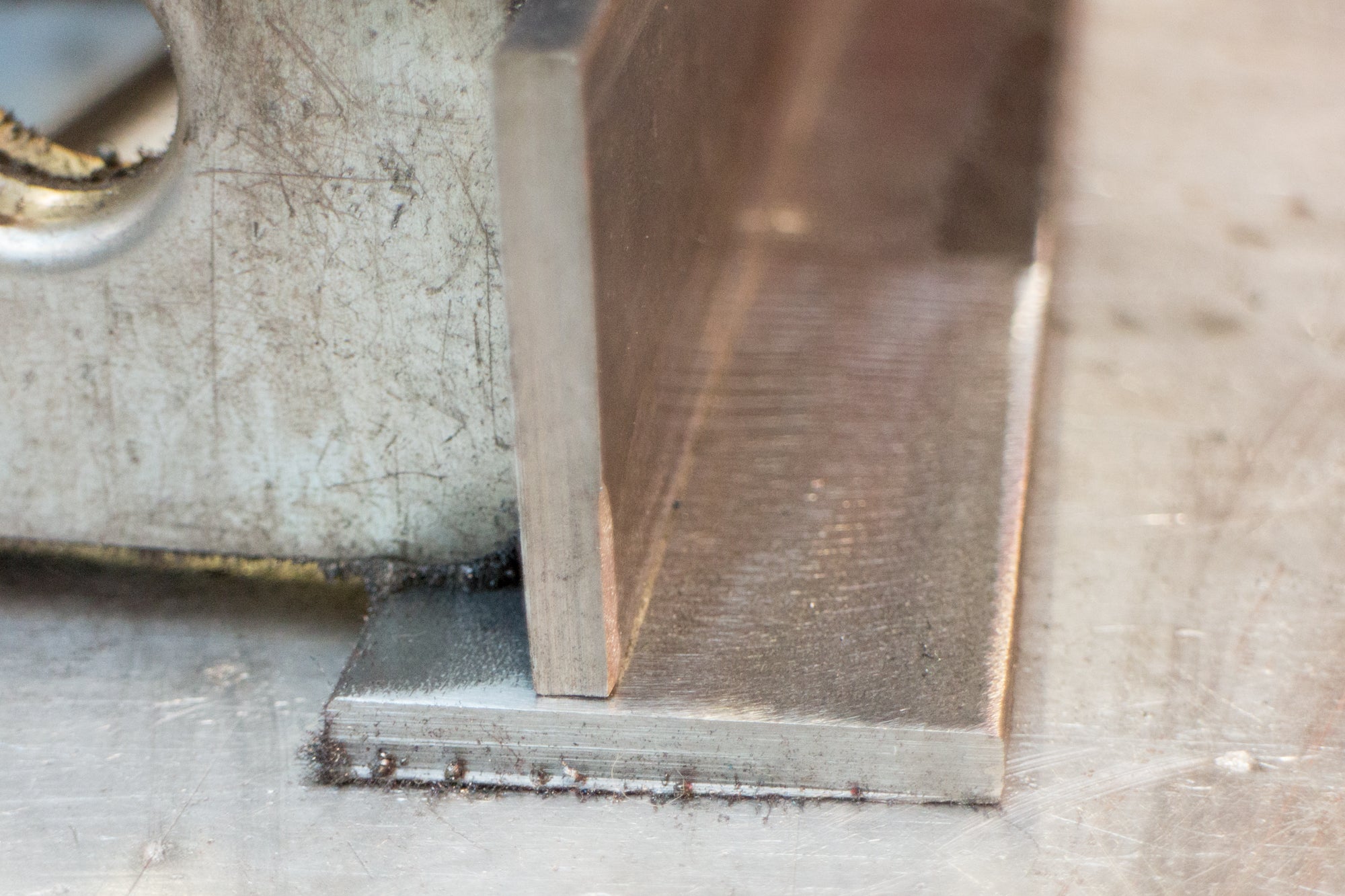 A fillet weld motion is not quite the same the chain of loops like we did for our butt weld, instead it is more like a rounded zig-zag shape, where we grab and melt the edges of the base material as we run the weld puddle across our joint. Run beads in sections along your joint, alternating side to side and back to front, working your way towards the middle. A nice fillet weld will form a neat even triangle shape between the pieces of perpendicular material.