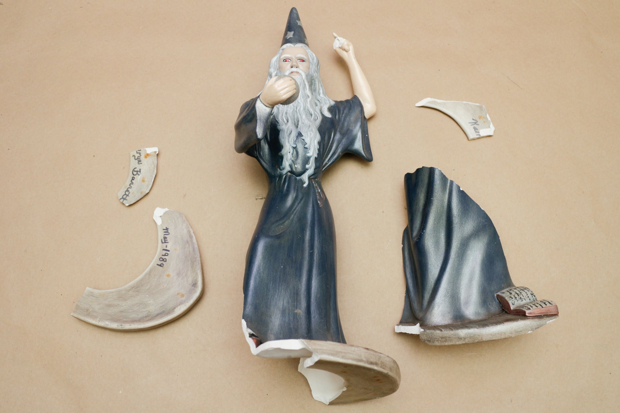 If you have lots of small parts, sometimes it is best to re-assemble shapes separately and slowly. I used a small spring clamp to hold together part of the wizard's footing before I reincorporated those parts back into the figurine.