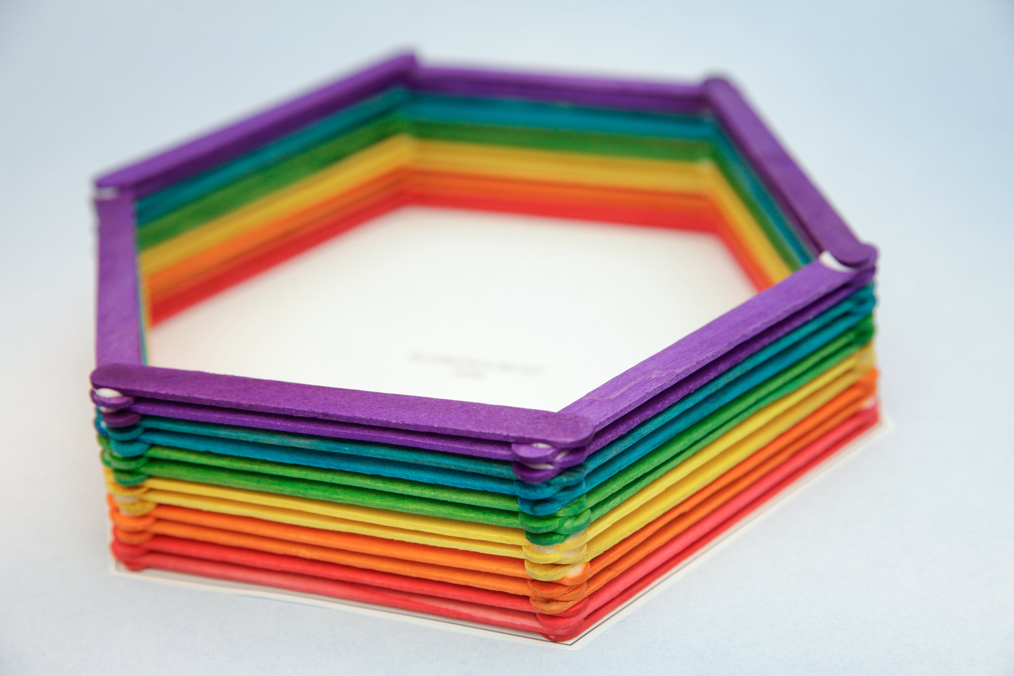 Carefully place three sticks around the perimeter of the paper pattern. Make small glue dots on the ends of the sticks where they will be mated with the next tier of sticks.