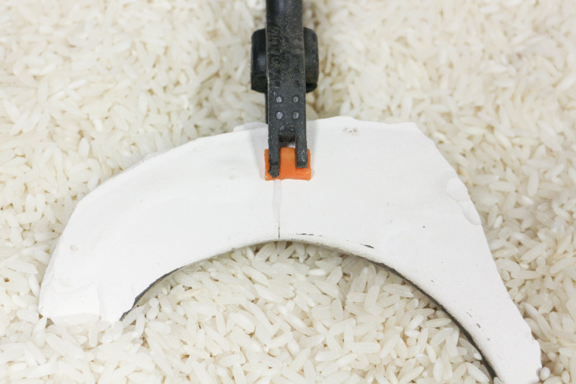 After I nested the parts and cleaned off any excess glue with a barely dampened shop towel, I secured the pieces to with a few rubber bands and placed it in the cure-box. The cure-box is a great way to jig parts to one another, you can move the rice around to support all kinds of shapes and hold parts in place while glue sets.