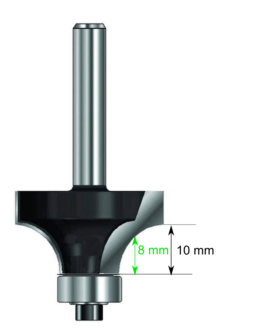 Now onto the routing. I got the bit I needed but had to find out that it didn't fit into my router. So I had to remove the base plate. I wanted to round the corners, but just slightly and not all the way. So instead of using the whole radius of 10 mm I used about 8 mm, as shown in the image on the left.