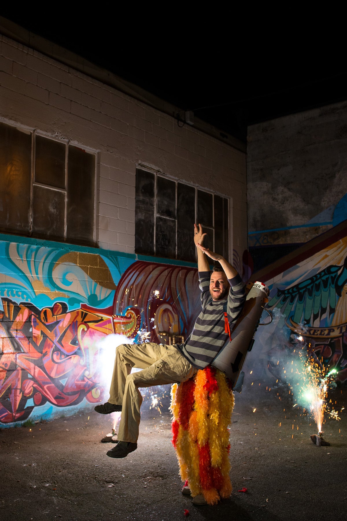 This project was a lot of fun and had a big payoff every time I lifted my arms to blast off, complete with sounds and lights. Below are some animated GIFs of the fireworks used during the photo shoot, the fireworks got a little out of control at one point, with sparks jumping dangerously close to my highly flammable costume.